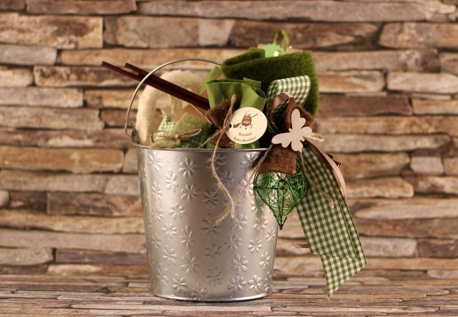 Entweder teilst Du uns grob mit, welche Farbe, welche Produkte (z. B. nur Seife, alles bunt gemischt, nur Räucherware etc.) in den Korb sollen und wir stellen einen einzigartig hübschen Präsentkorb für Dich zusammen