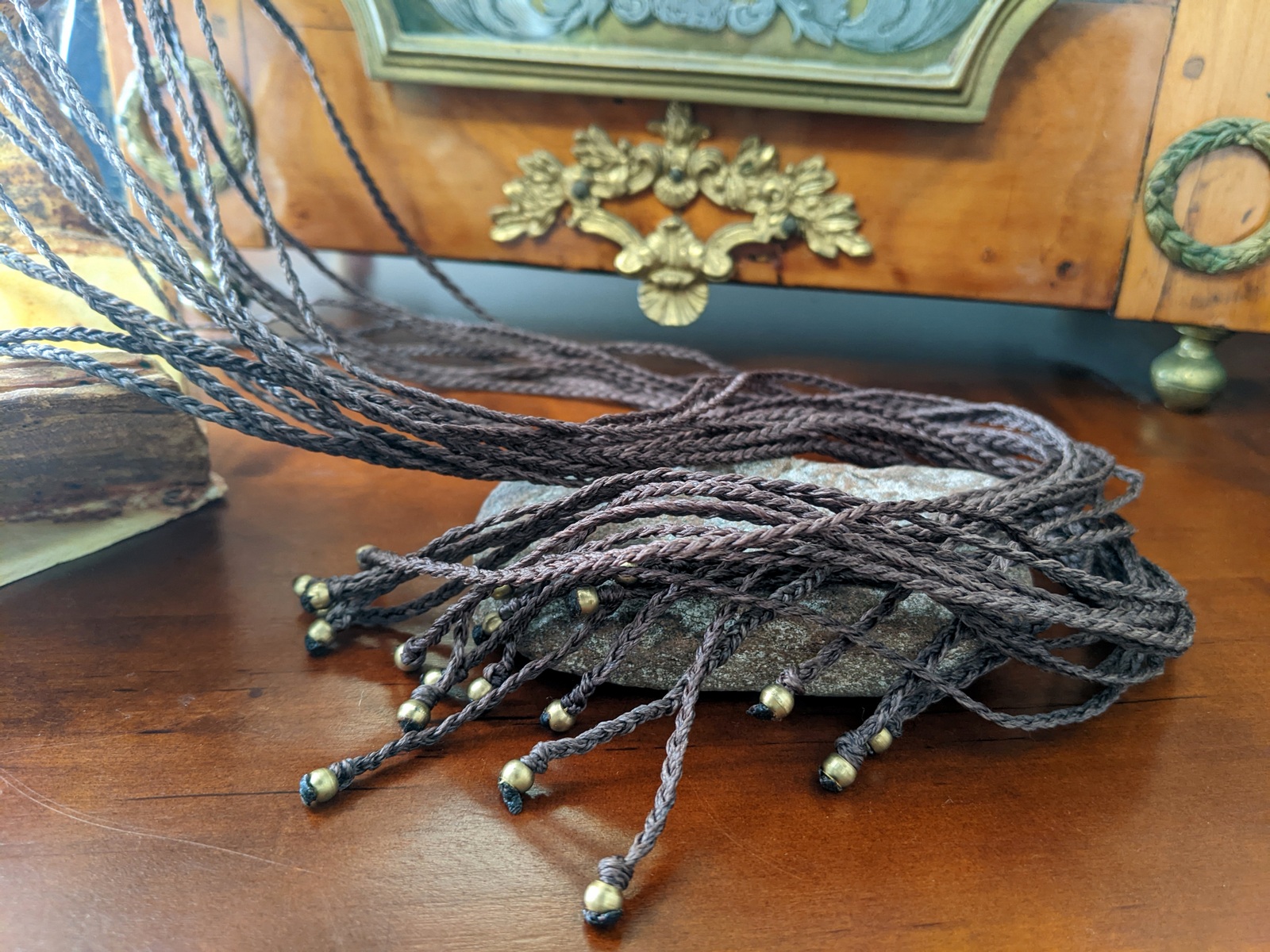 Eine feine (Stärke ca. 2,5mm) geflochtene Makramee Kette für Anhänger, Brille oder auch um es ins Haar zu flechten. Die Enden sind mit kleinen Messingkugeln versehen. Das Band aus gewachster Baumwolle kann selbst zum Schiebeknoten gebunden werden.